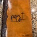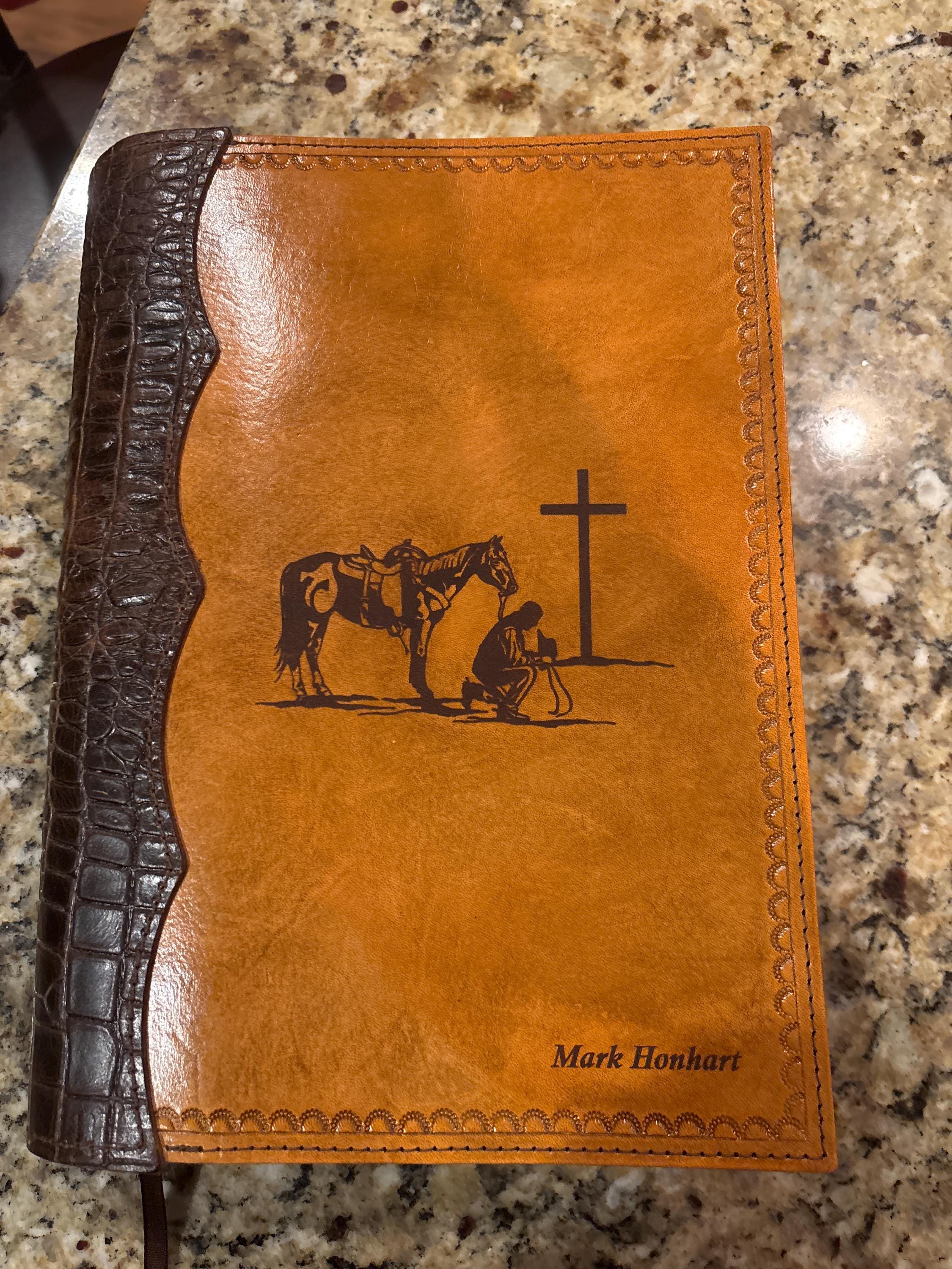 This is beautiful handcrafted all leather bible cover that has been laser engraved with a detailed Praying Cowboy design. The front and back are made from top grain leather with hand tooled edges and has been finished in an antique tan stain and features a chocolate alligator embossed leather bind. It will hold up to 9 3/4”x 6 3/8” x 2” soft bound bible. It has inner chap leather (suede) sleeves to hold bible in place with a pocket on sleeve. Customized engraving for an additional $20.00 is available. If I don't have a design you'd like please message me as I can do many other designs.