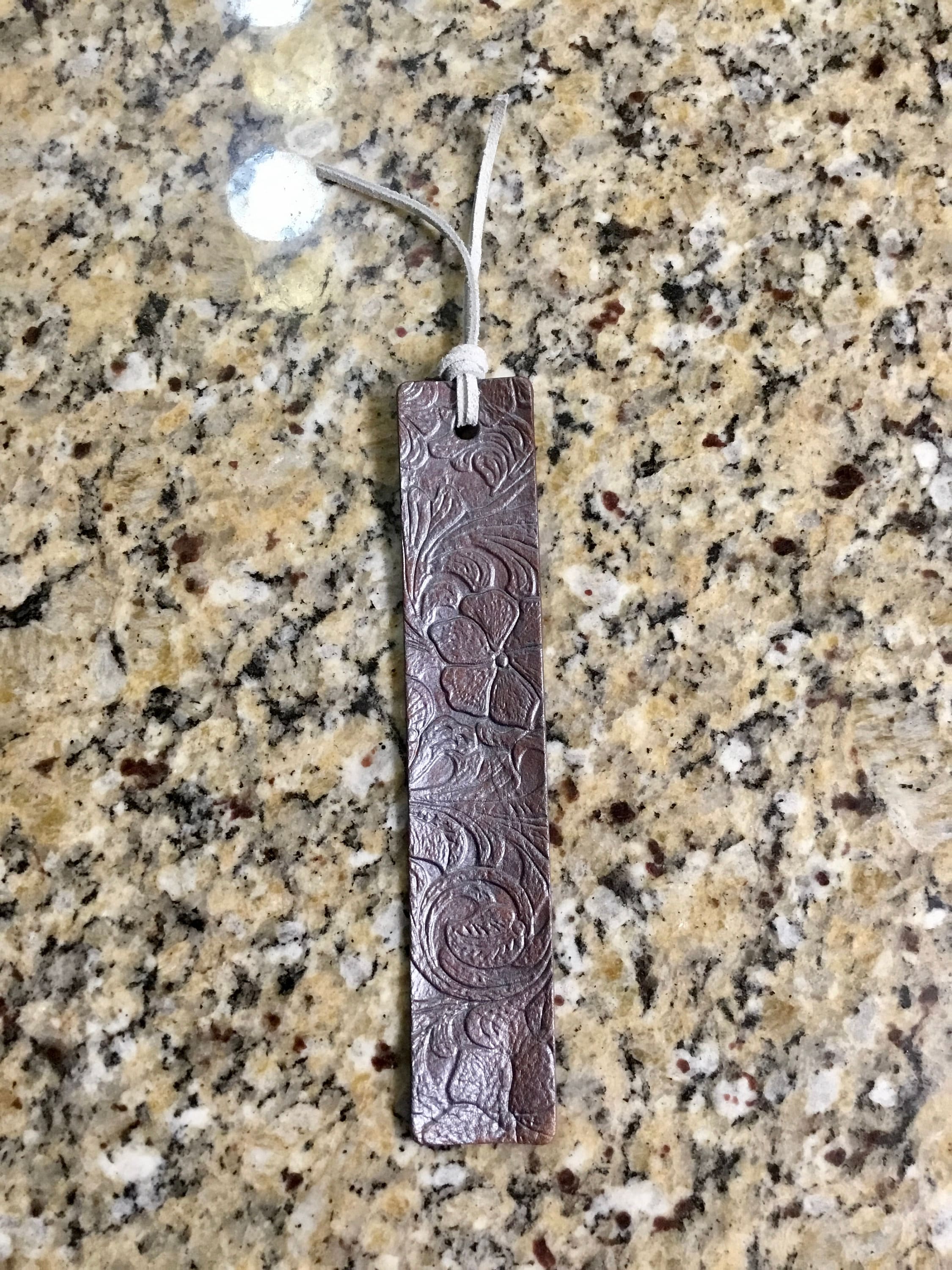 This is a leather bookmark made from a floral embossed leather and has a leather string tassel. I have several color options and You may select your color choice when placing your order. The face and back of these are sealed. The bookmark measures 8’ tall (not including tassel) by 1.5” across If you These make great gifts.