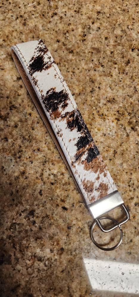Handmade in the USA by me in my shop, beautiful cowhide keychain wristlets. Don’t be fooled by other listings that have cowhide wristlets for sale that have been imported or purchased somewhere else for resale. I have personally cut, stitched and finished these in my shop right here in Arkansas. Each cowhide is unique and makes a wonderful statement no matter which one or ones you choose. I’ve matched up each cowhide with a coordinating leather inside. A few of the styles feature super soft and supple turquoise Italian leather and matching turquoise stitching. These have been glued and stitched together making for a super strong and long lasting wristlet. Normally my items are listed individually, but I’ve made a huge selection of these, so I’ve tried to make it easier by numbering the pics with the fronts and backs so you can see and select the exact one you want as opposed to saying you’ll get one of the colors you select. I’d rather give my customers exactly what they want.