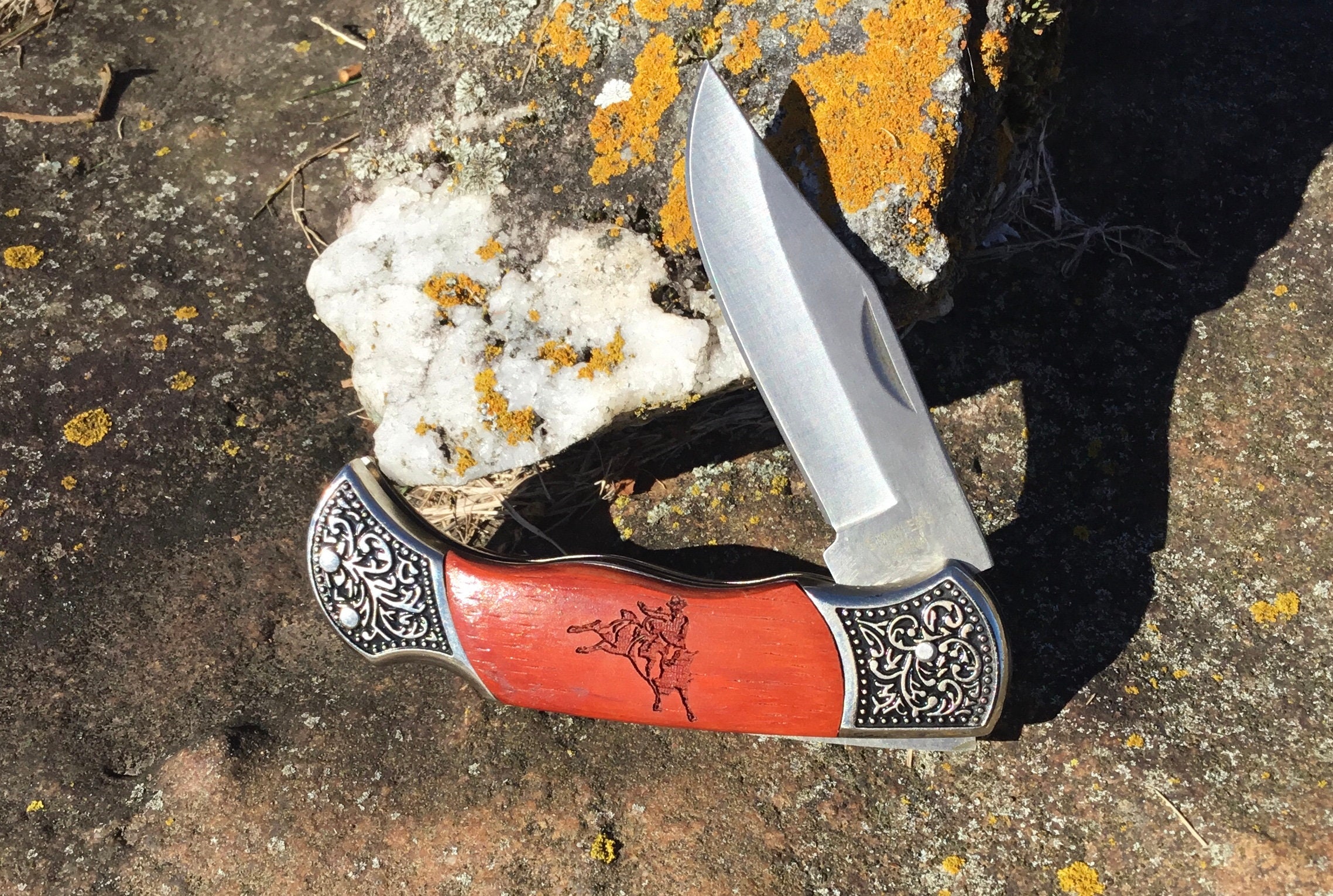 This is a beautiful rosewood knife that has been laser engraved one one side of the handle with a bull rider design. The knife measures 4"X1.5" closed. The blade is 3.25" long. Custom designs are available at an addition charge but you must select the correct variation from the drop down menu and include customizations in your comments section of yout order. Feel free to ask questions about customizations